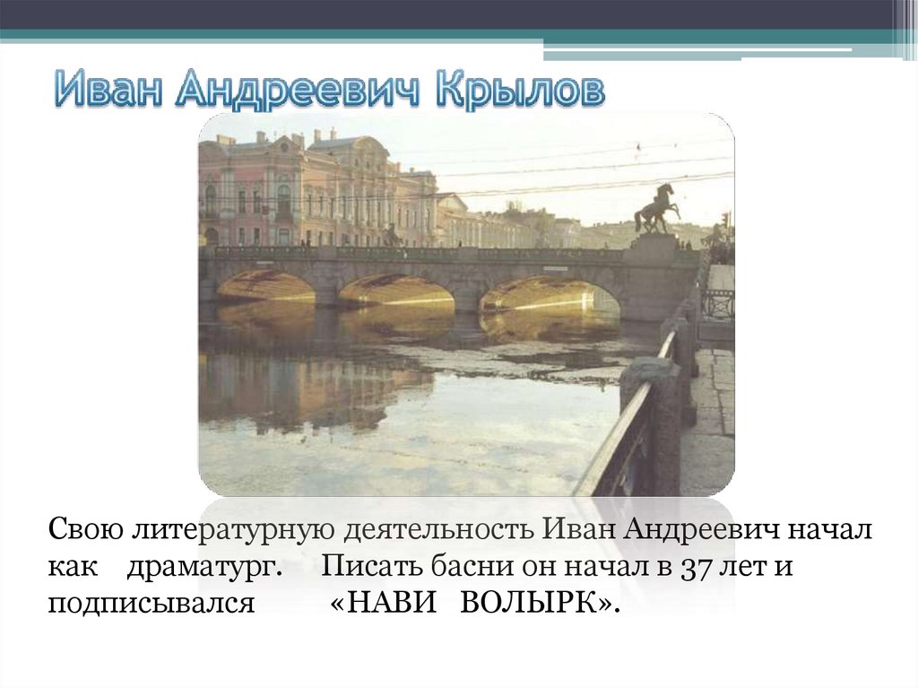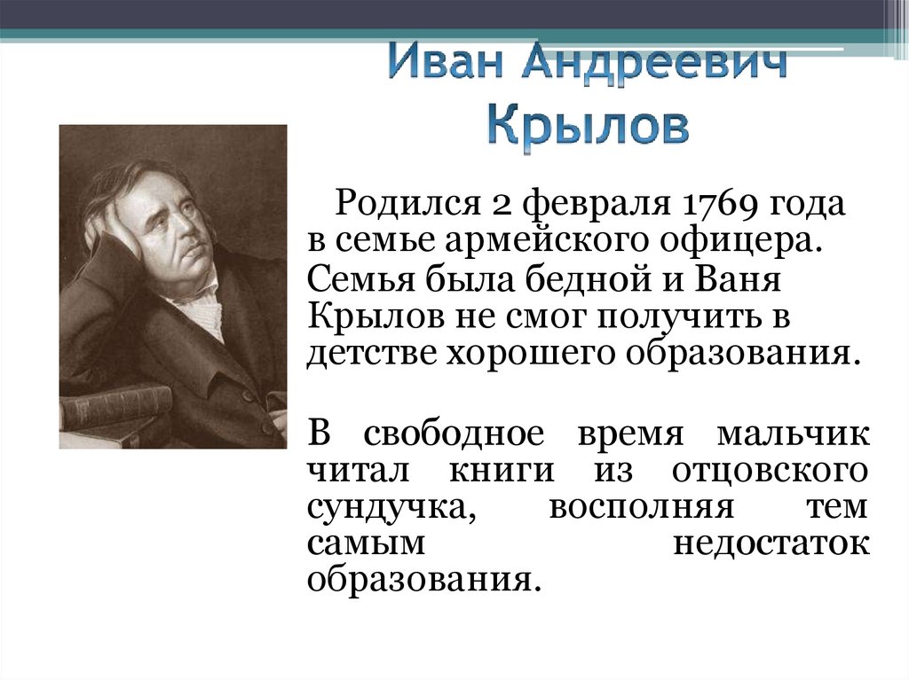 Свою литературную деятельность Иван Андреевич началкак драматург. Писать басни он начал в 37 лет и
