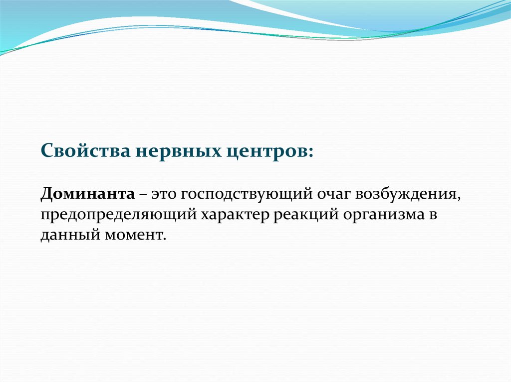 Свойства нервных центров:Доминанта – это господствующий очаг возбуждения,