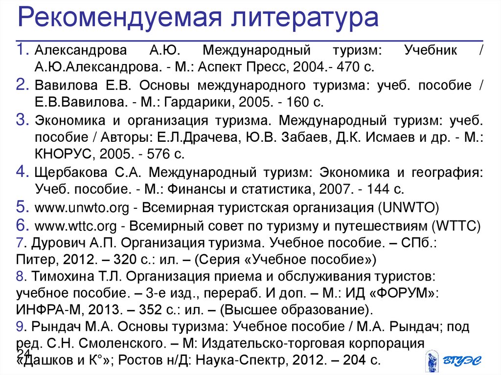 2. Вавилова Е.В. Основы международного туризма: учеб. пособие /
