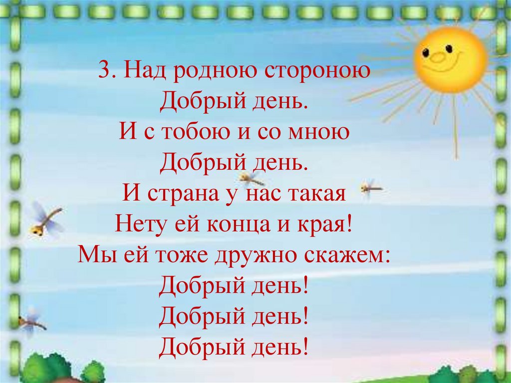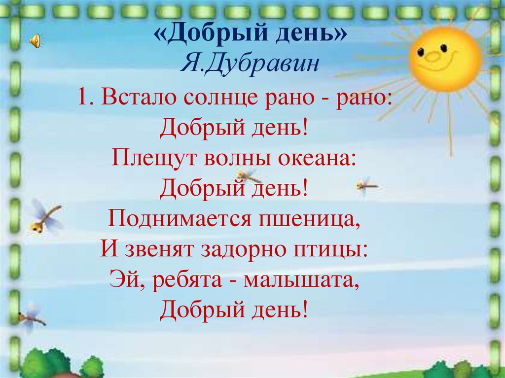 1. Утром солнышко встаёт.Всех на улицу зовёт. 3. Подпеваю травам я,