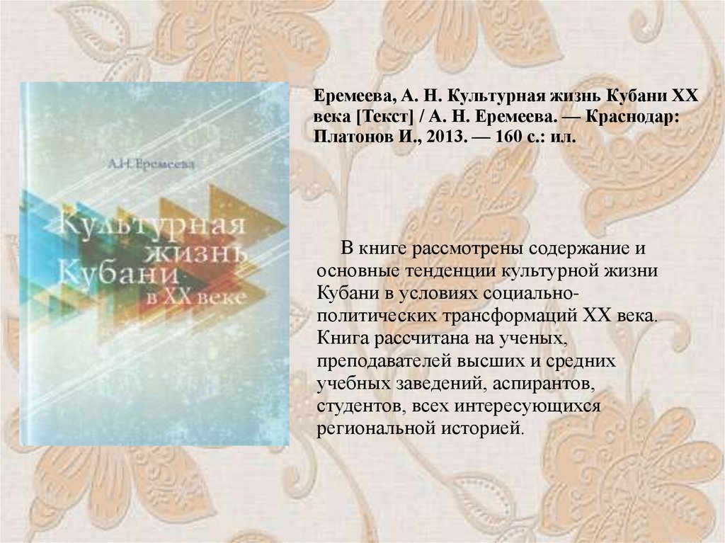 Еремеева, А. Н. Культурная жизнь Кубани ХХвека [Текст] / А. Н. Еремеева. — Краснодар: