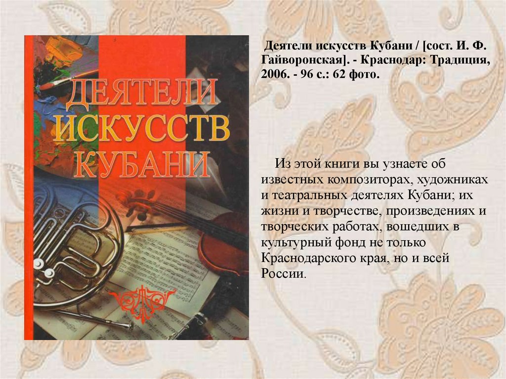 Деятели искусств Кубани / [сост. И. Ф.Гайворонская]. - Краснодар: Традиция,