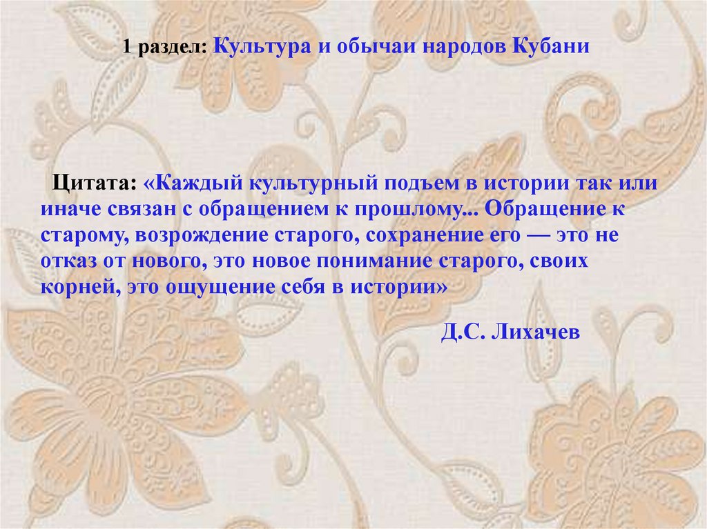 1 раздел: Культура и обычаи народов КубаниЦитата: «Каждый культурный подъем в истории так или