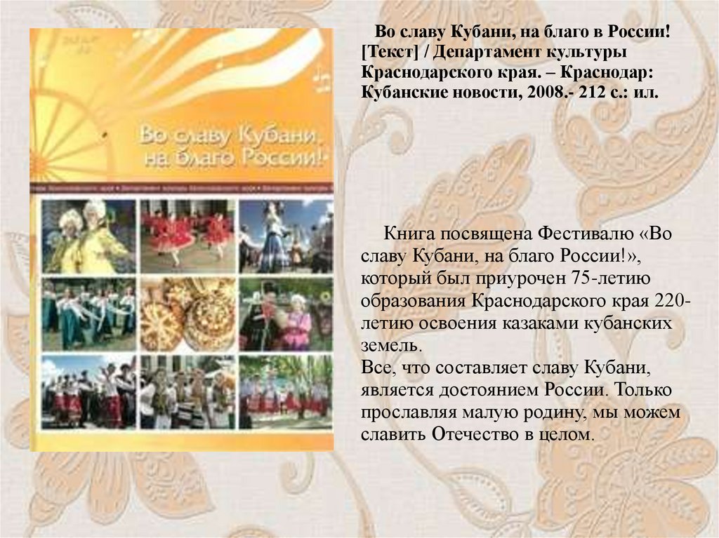 Во славу Кубани, на благо в России![Текст] / Департамент культуры