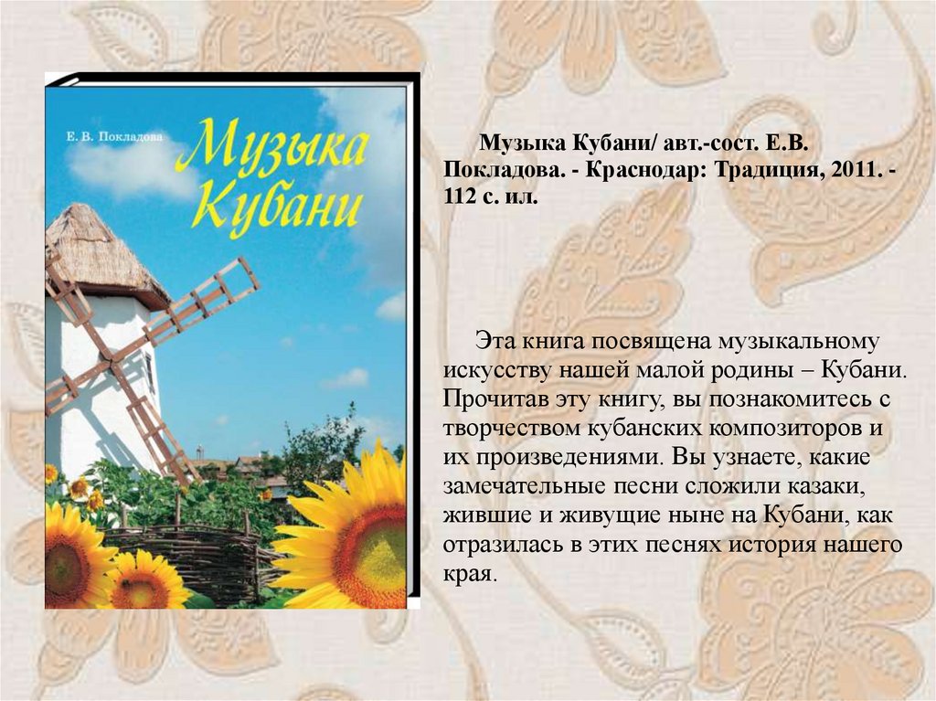 Музыка Кубани/ авт.-сост. Е.В.Покладова. - Краснодар: Традиция, 2011. 112 с. ил.