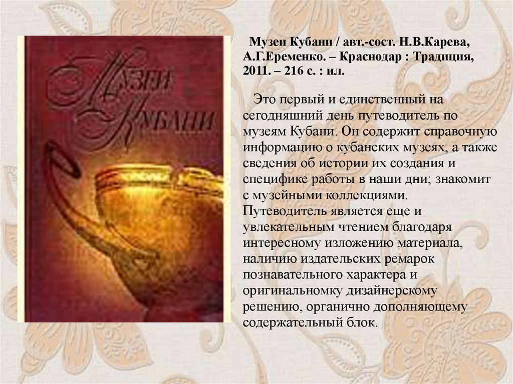 Музеи Кубани / авт.-сост. Н.В.Карева,А.Г.Еременко. – Краснодар : Традиция,