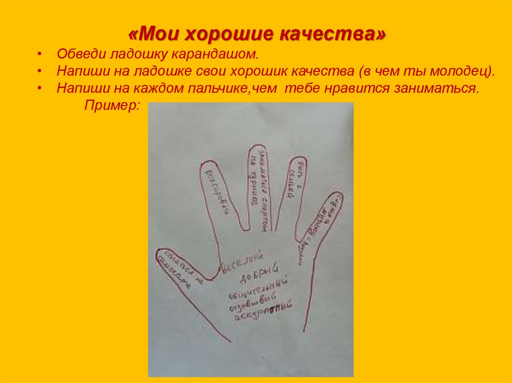 • Напиши на ладошке свои хорошик качества (в чем ты молодец).