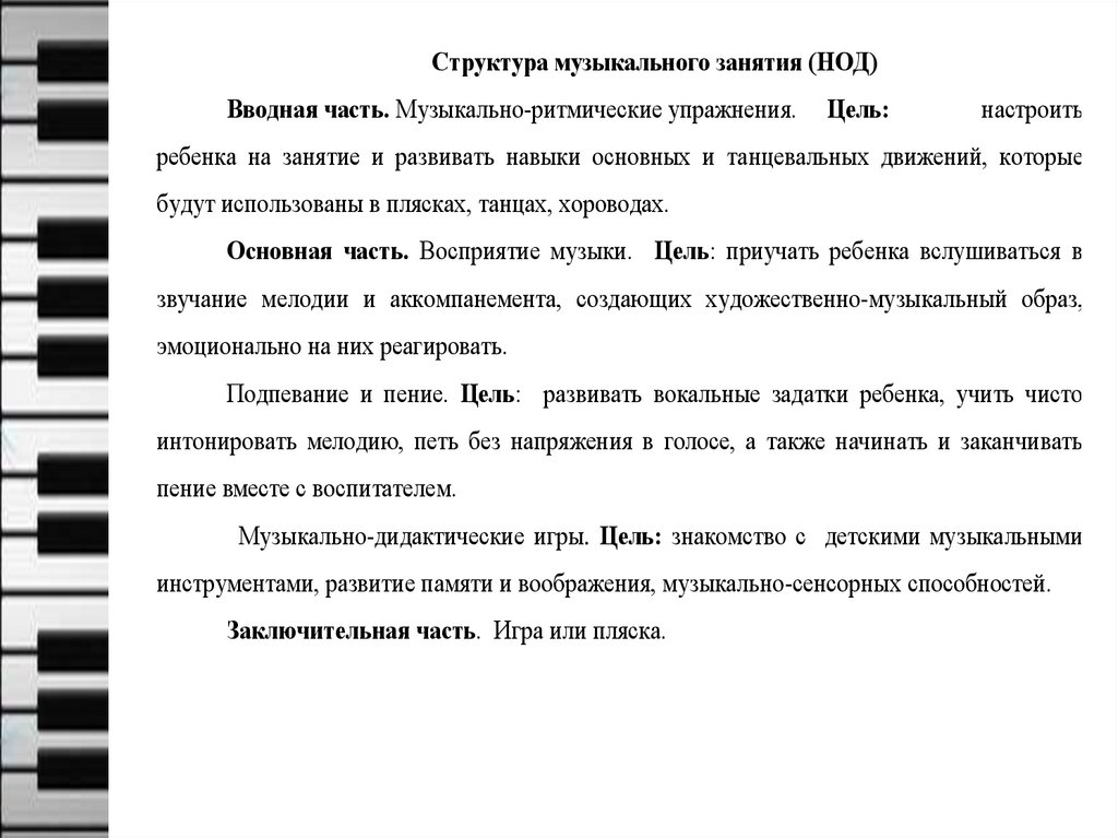 Структура музыкального занятия (НОД)Вводная часть. Музыкально-ритмические упражнения.
