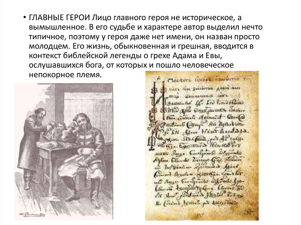 • ГЛАВНЫЕ ГЕРОИ Лицо главного героя не историческое, авымышленное. В его судьбе и характере автор выделил нечто