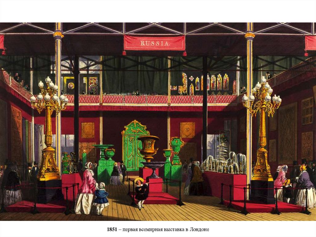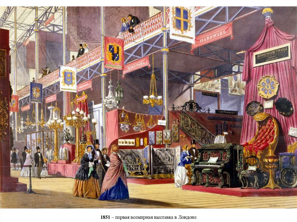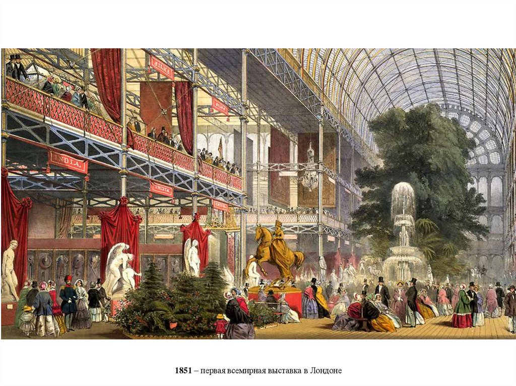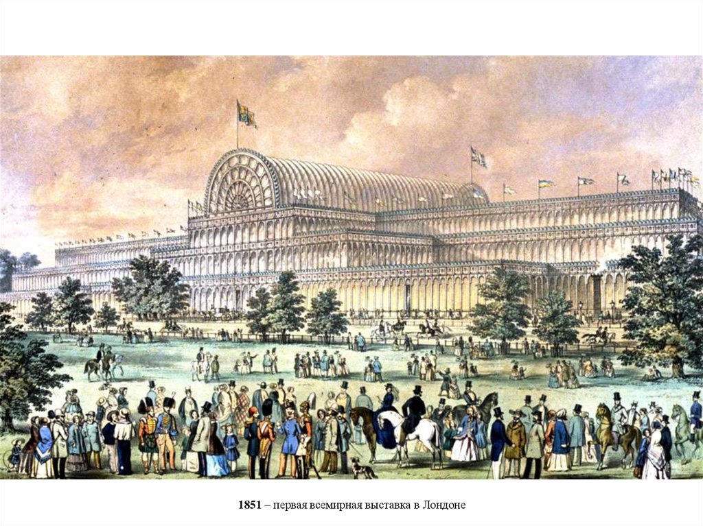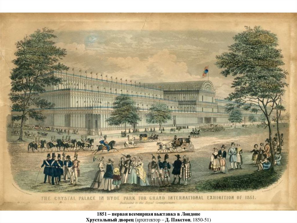 1851 – первая всемирная выставка в ЛондонеХрустальный дворец (архитектор – Д. Пакстон, 1851)