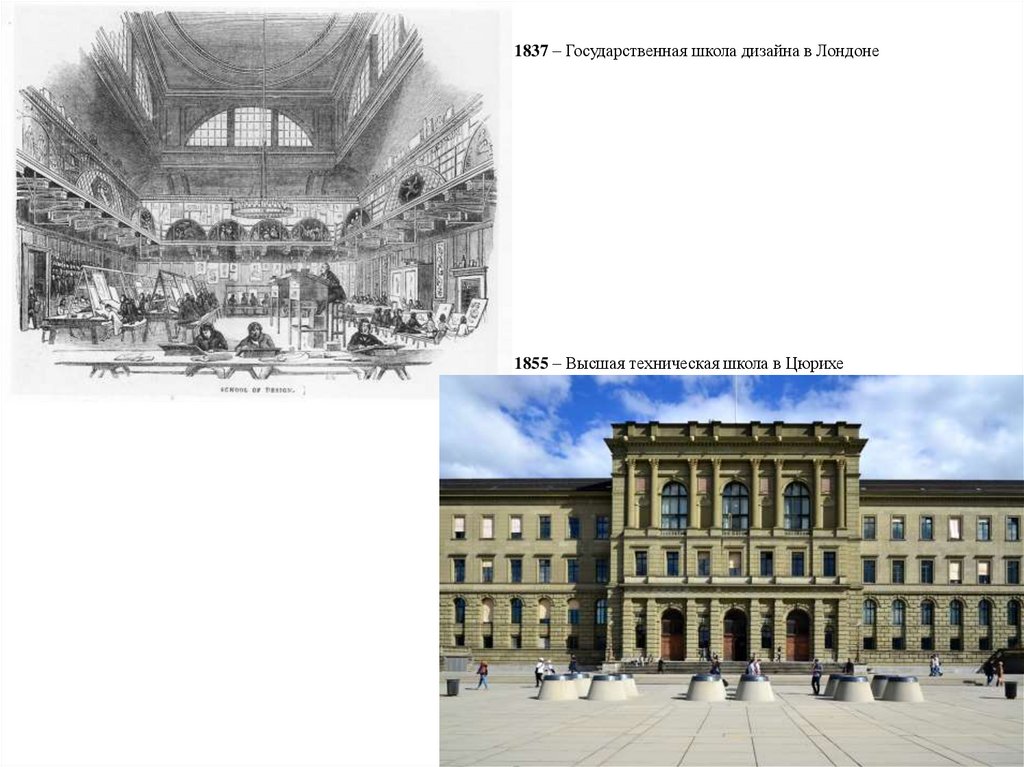 1837 – Государственная школа дизайна в Лондоне1855 – Высшая техническая школа в Цюрихе