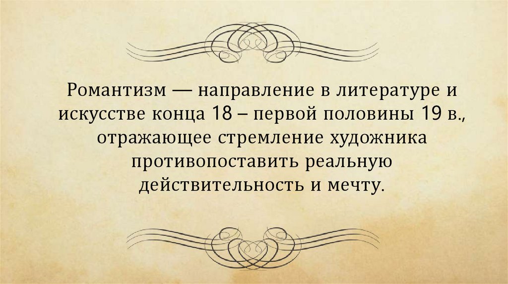 Романтизм — направление в литературе иискусстве конца 18 – первой половины 19 в.,