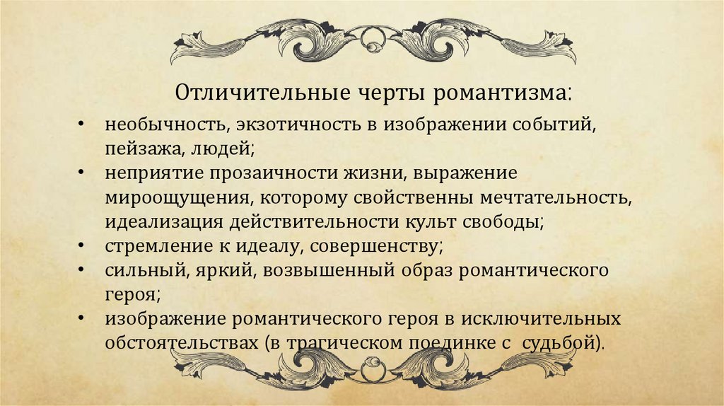 Отличительные черты романтизма:• необычность, экзотичность в изображении событий,