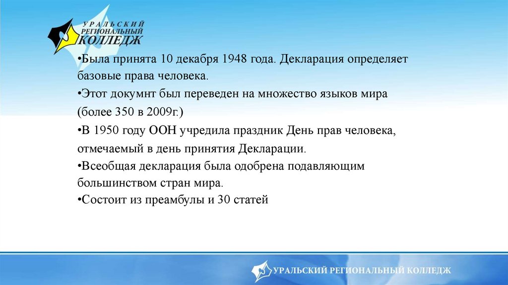 •Была принята 10 декабря 1948 года. Декларация определяетбазовые права человека.