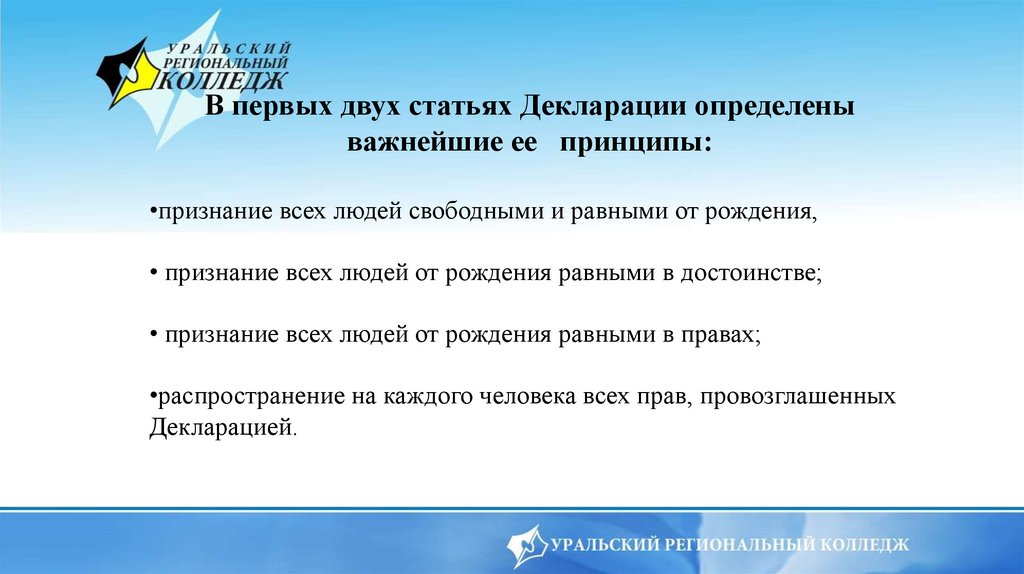 В первых двух статьях Декларации определеныважнейшие ее принципы: