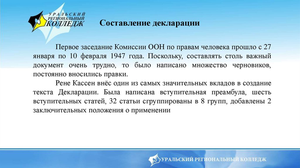 Составление декларацииПервое заседание Комиссии ООН по правам человека прошло с 27