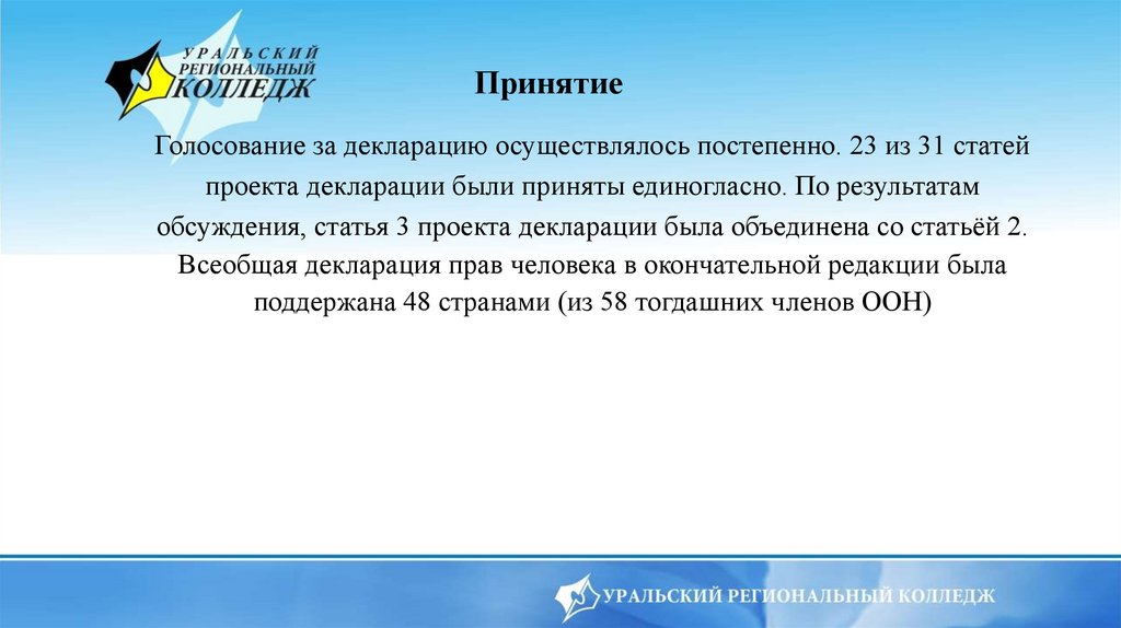 ПринятиеГолосование за декларацию осуществлялось постепенно. 23 из 31 статей