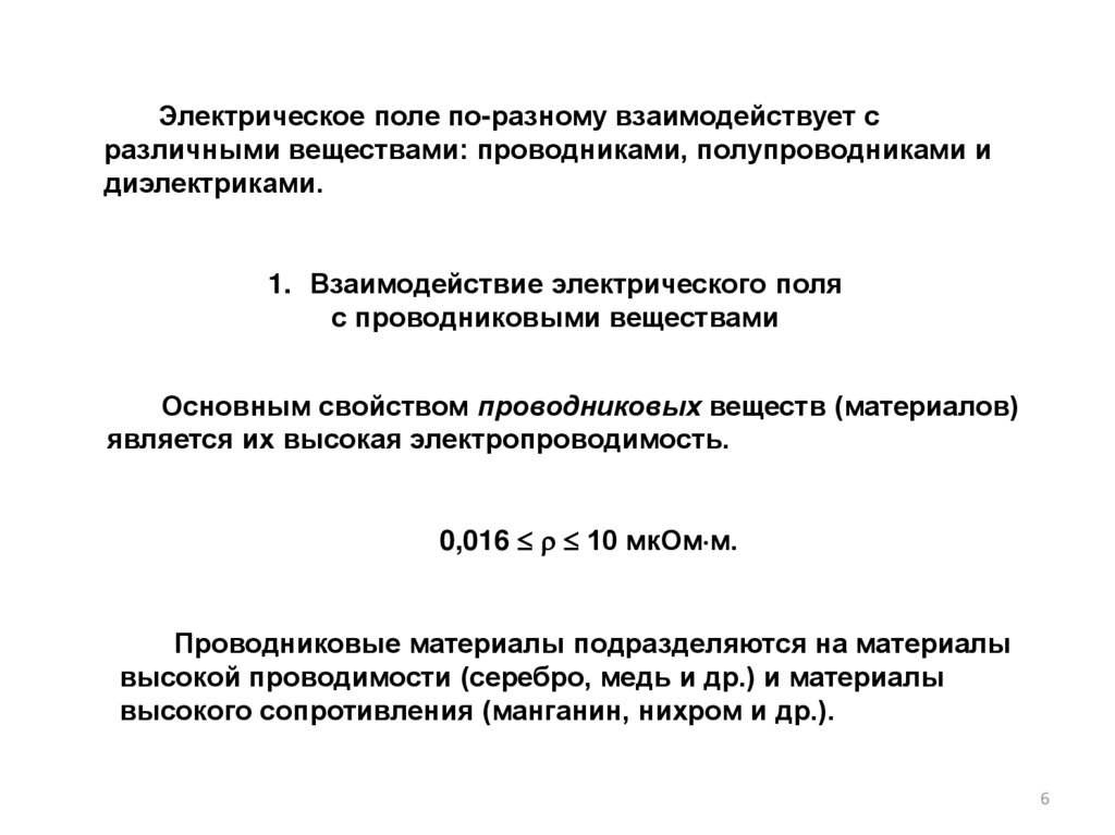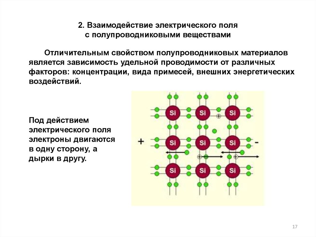 Электрическое поле по-разному взаимодействует сразличными веществами: проводниками, полупроводниками и