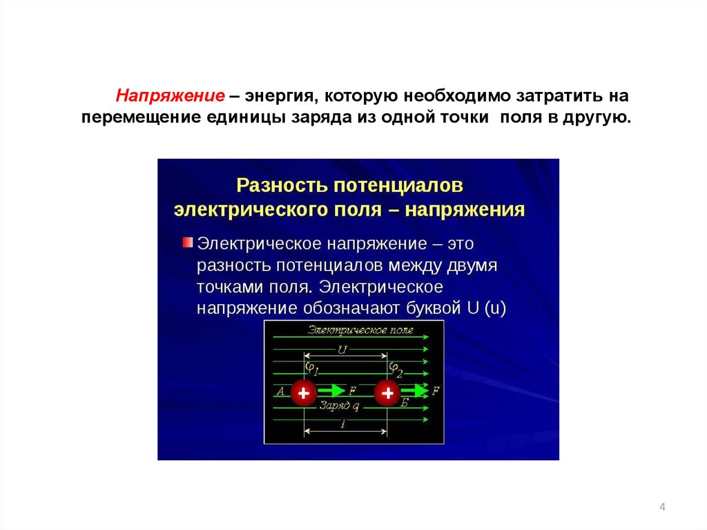 Напряжение – энергия, которую необходимо затратить наперемещение единицы заряда из одной точки поля в другую.