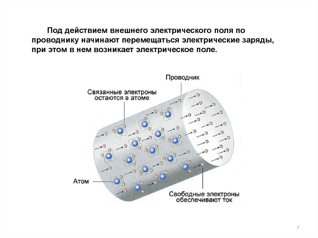 Под действием внешнего электрического поля попроводнику начинают перемещаться электрические заряды,