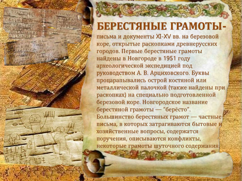 БЕРЕСТЯНЫЕ ГРАМОТЫ-письма и документы XI-XV вв. на березовой