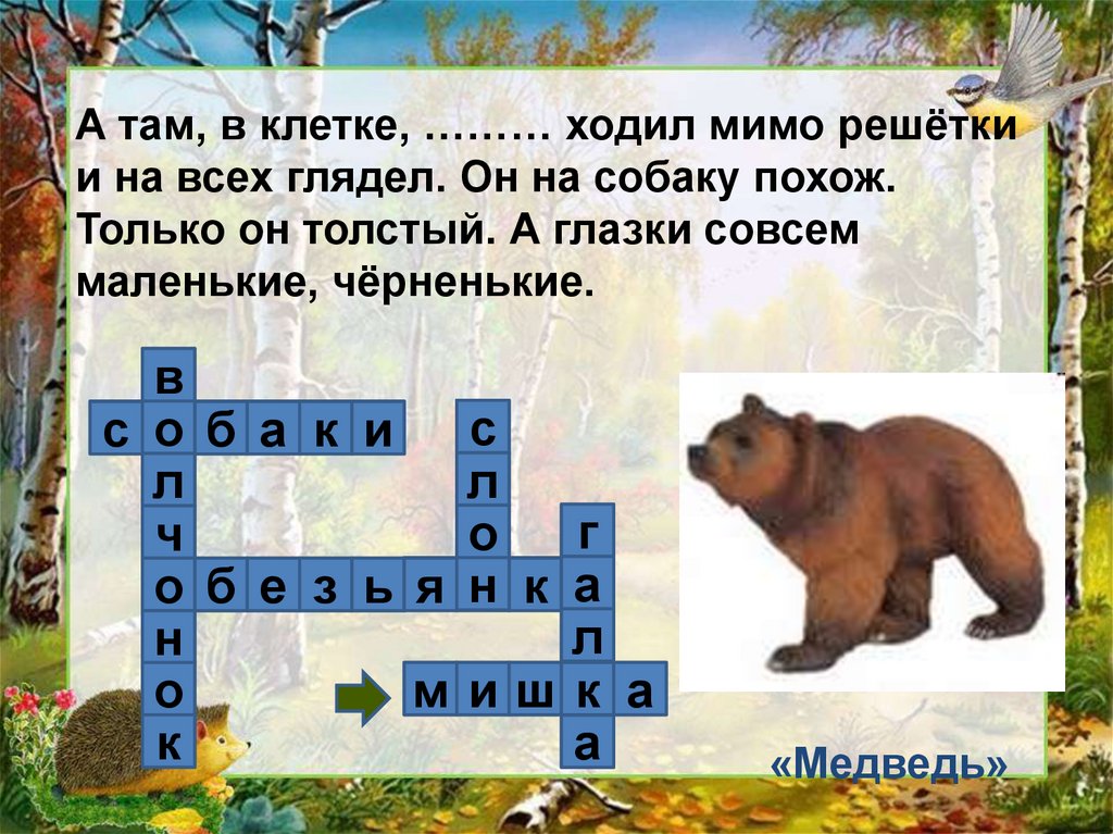 А там, в клетке, ……… ходил мимо решёткии на всех глядел. Он на собаку похож.