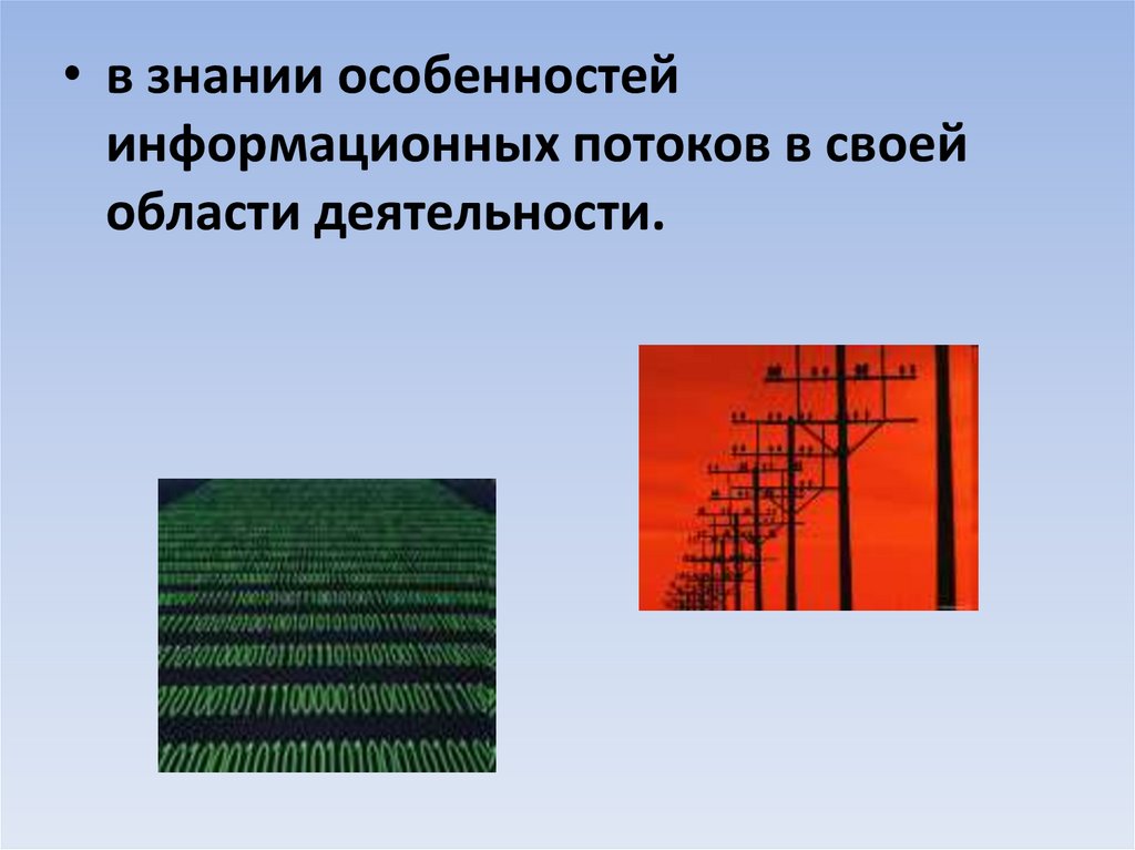• в знании особенностейинформационных потоков в своей