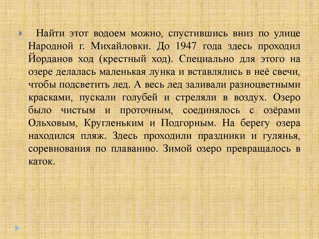 Найти этот водоем можно, спустившись вниз по улицеНародной г. Михайловки. До 1947 года здесь проходил