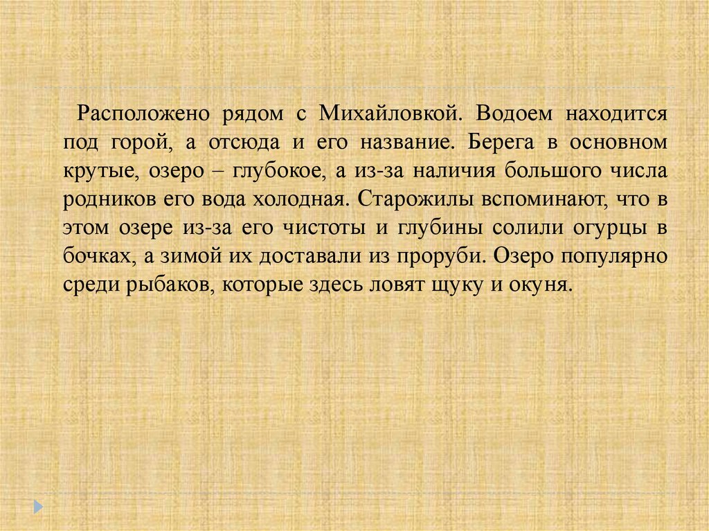 Расположено рядом с Михайловкой. Водоем находитсяпод горой, а отсюда и его название. Берега в основном