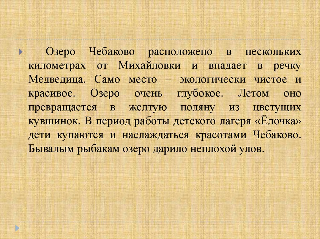 Озеро Чебаково расположено в несколькихкилометрах от Михайловки и впадает в речку