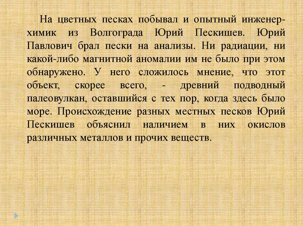 На цветных песках побывал и опытный инженерхимик из Волгограда Юрий Пескишев. ЮрийПавлович брал пески на анализы. Ни радиации, ни