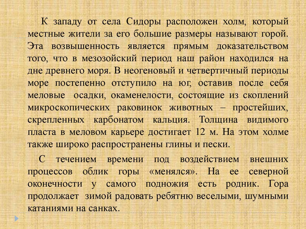 К западу от села Сидоры расположен холм, которыйместные жители за его большие размеры называют горой.