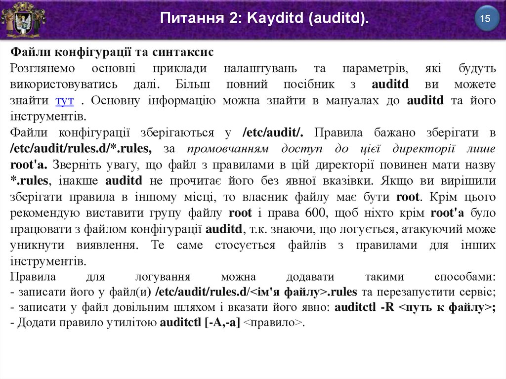 засобами SIEM) всі події, пов'язані, наприклад, з ssh, sudoers, passwd і т.д., спочатку