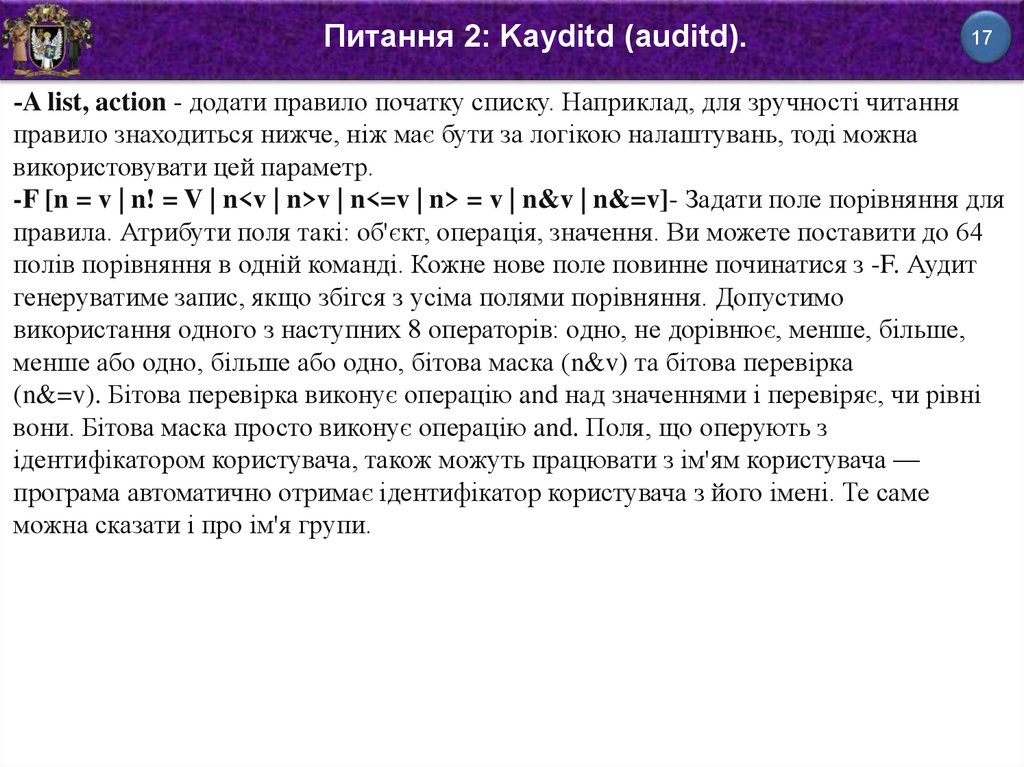 полів порівняння в одній команді. Кожне нове поле повинне починатися з -F. Аудит