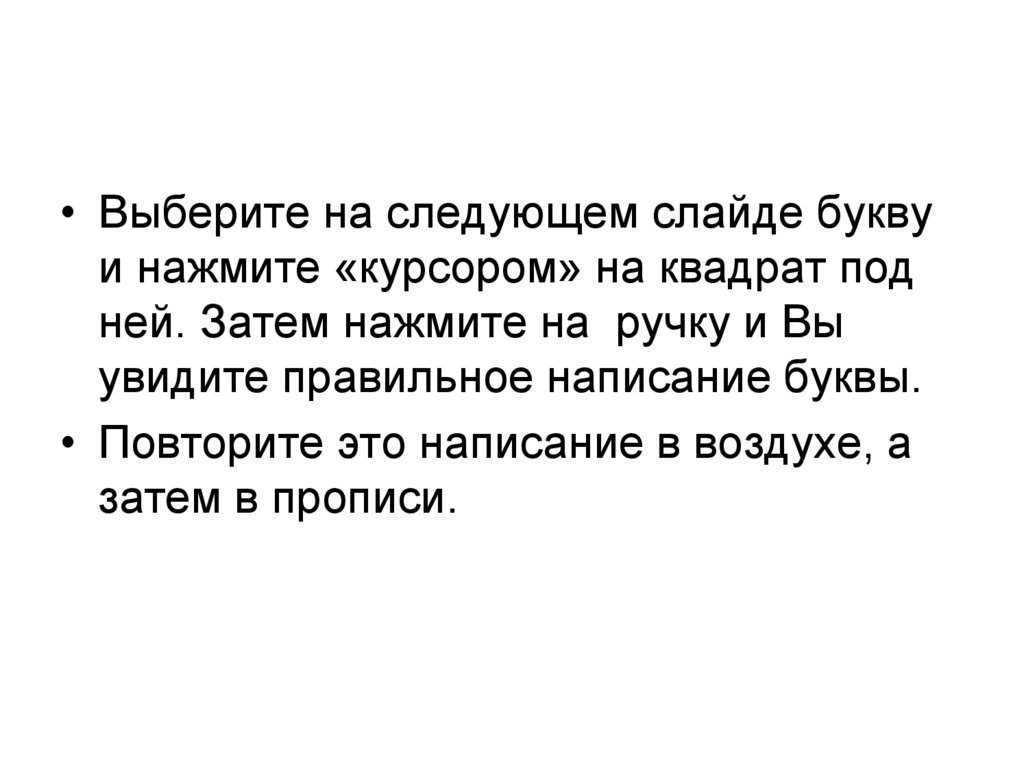 • Выберите на следующем слайде буквуи нажмите «курсором» на квадрат под