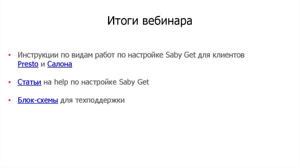 Итоги вебинара• Инструкции по видам работ по настройке Saby Get для клиентов