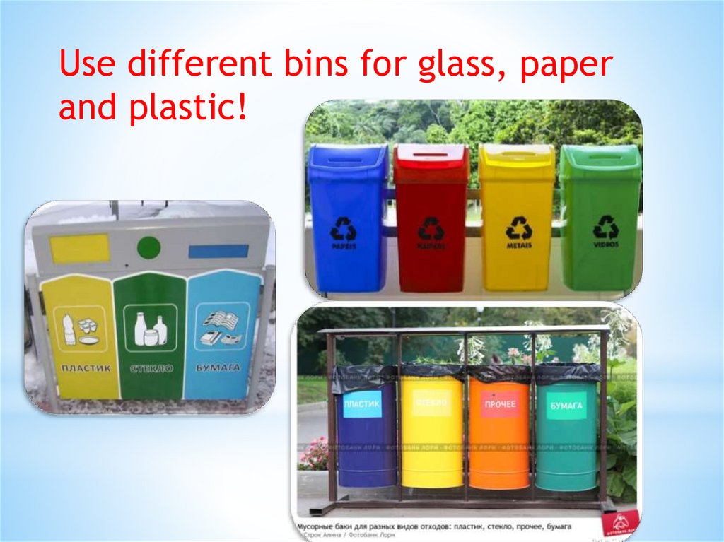 Use different bins for glass, paperand plastic!