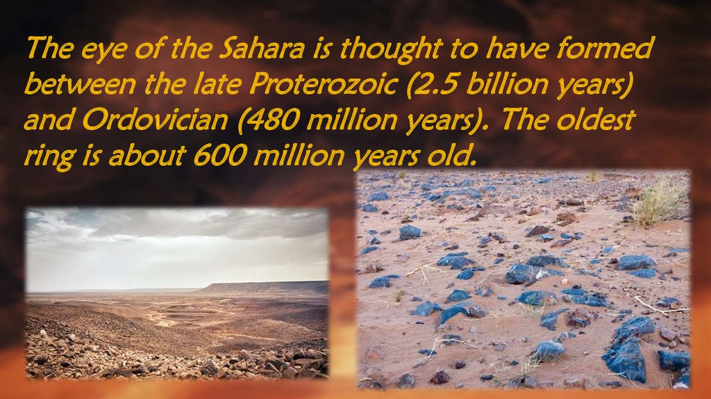 The eye of the Sahara is thought to have formedbetween the late Proterozoic (2.5 billion years)