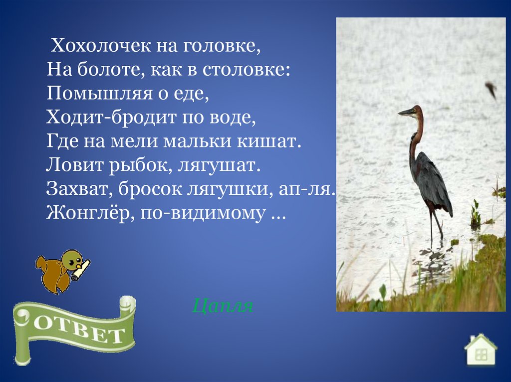 Хохолочек на головке,На болоте, как в столовке: