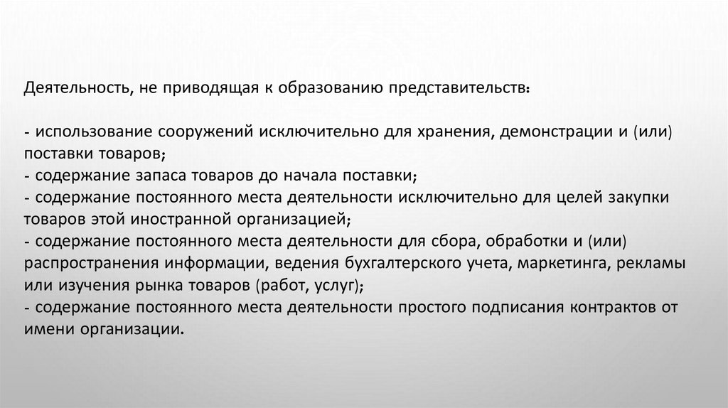 Деятельность, не приводящая к образованию представительств:- использование сооружений исключительно для хранения, демонстрации и (или)