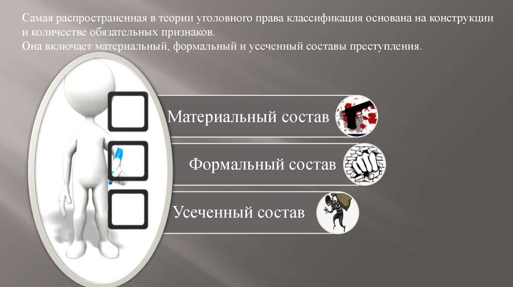 Самая распространенная в теории уголовного права классификация основана на конструкциии количестве обязательных признаков.
