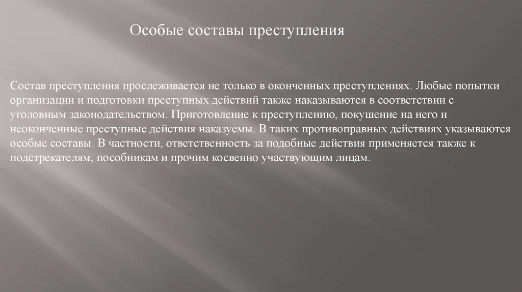 Особые составы преступленияСостав преступления прослеживается не только в оконченных преступлениях. Любые попытки