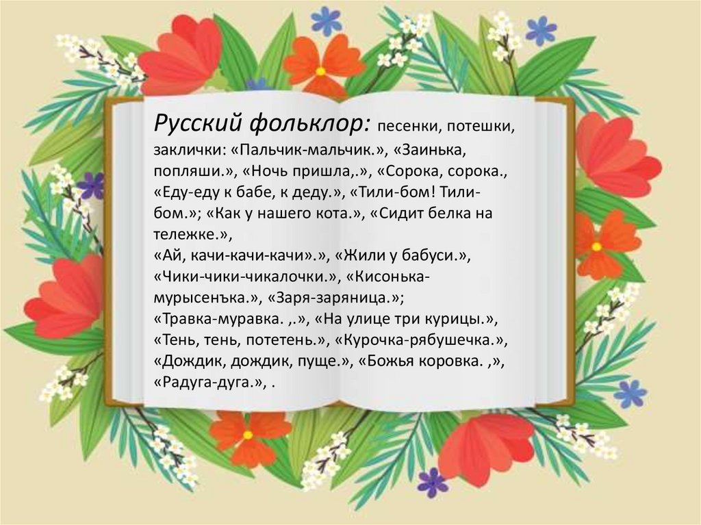 Русский фольклор: песенки, потешки,заклички: «Пальчик-мальчик.», «Заинька,
