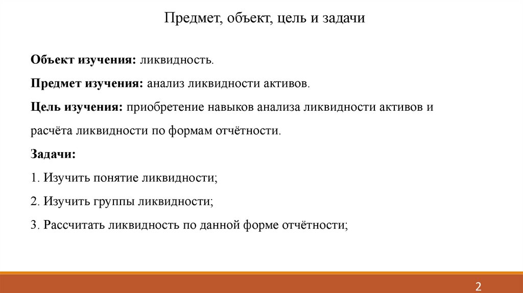 Предмет, объект, цель и задачиОбъект изучения: ликвидность.