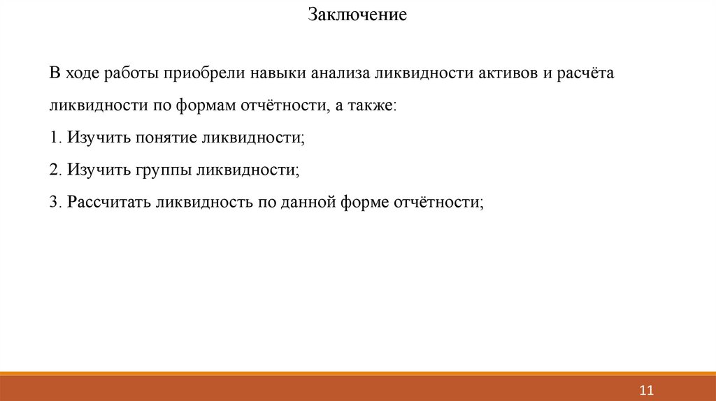 ЗаключениеВ ходе работы приобрели навыки анализа ликвидности активов и расчёта