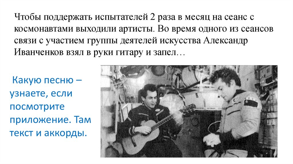 Чтобы поддержать испытателей 2 раза в месяц на сеанс скосмонавтами выходили артисты. Во время одного из сеансов