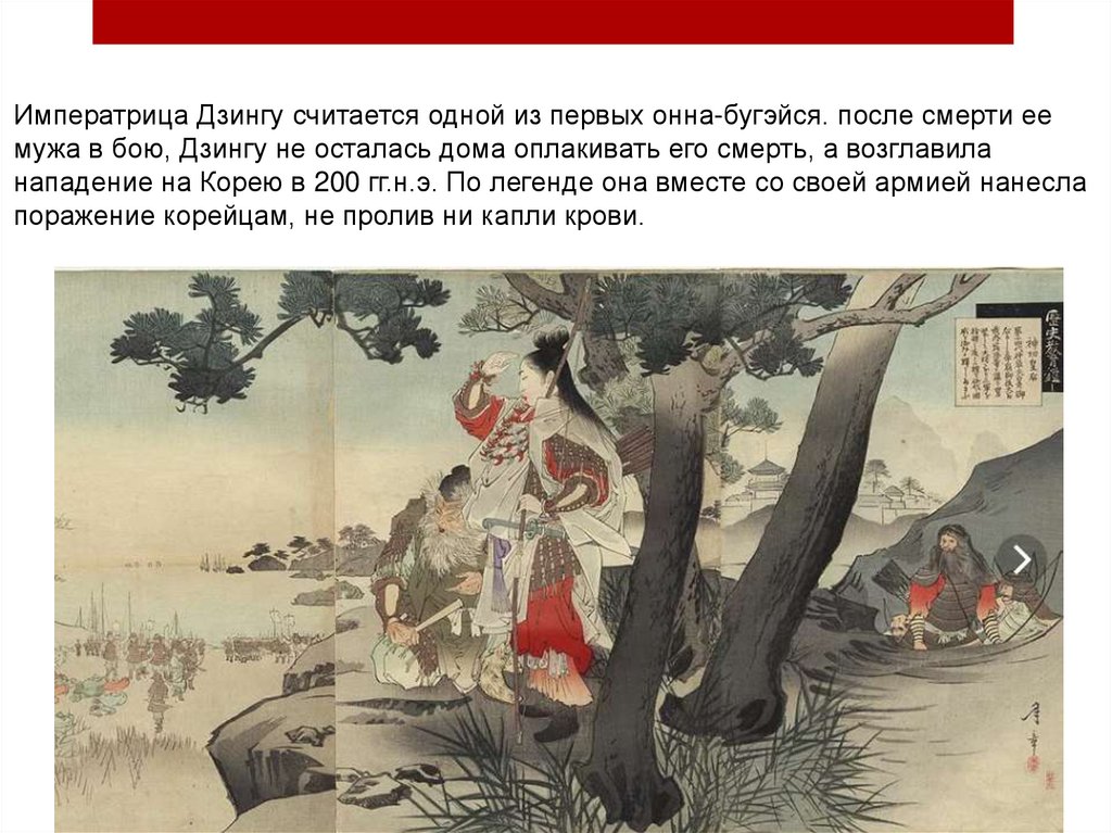 Императрица Дзингу считается одной из первых онна-бугэйся. после смерти еемужа в бою, Дзингу не осталась дома оплакивать его смерть, а возглавила