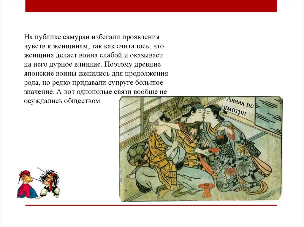 На публике самураи избегали проявлениячувств к женщинам, так как считалось, что