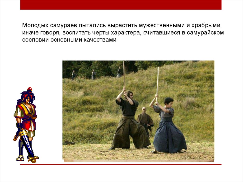 Молодых самураев пытались вырастить мужественными и храбрыми,иначе говоря, воспитать черты характера, считавшиеся в самурайском