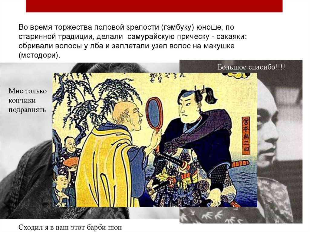 Во время торжества половой зрелости (гэмбуку) юноше, постаринной традиции, делали самурайскую прическу - сакаяки: